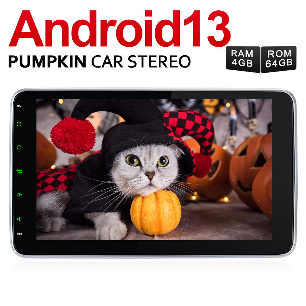 Pumpkin 10.1 inch 1 Din Android 13 car radio with rotating screen, supports Android Auto CarPlay Bluetooth navigation